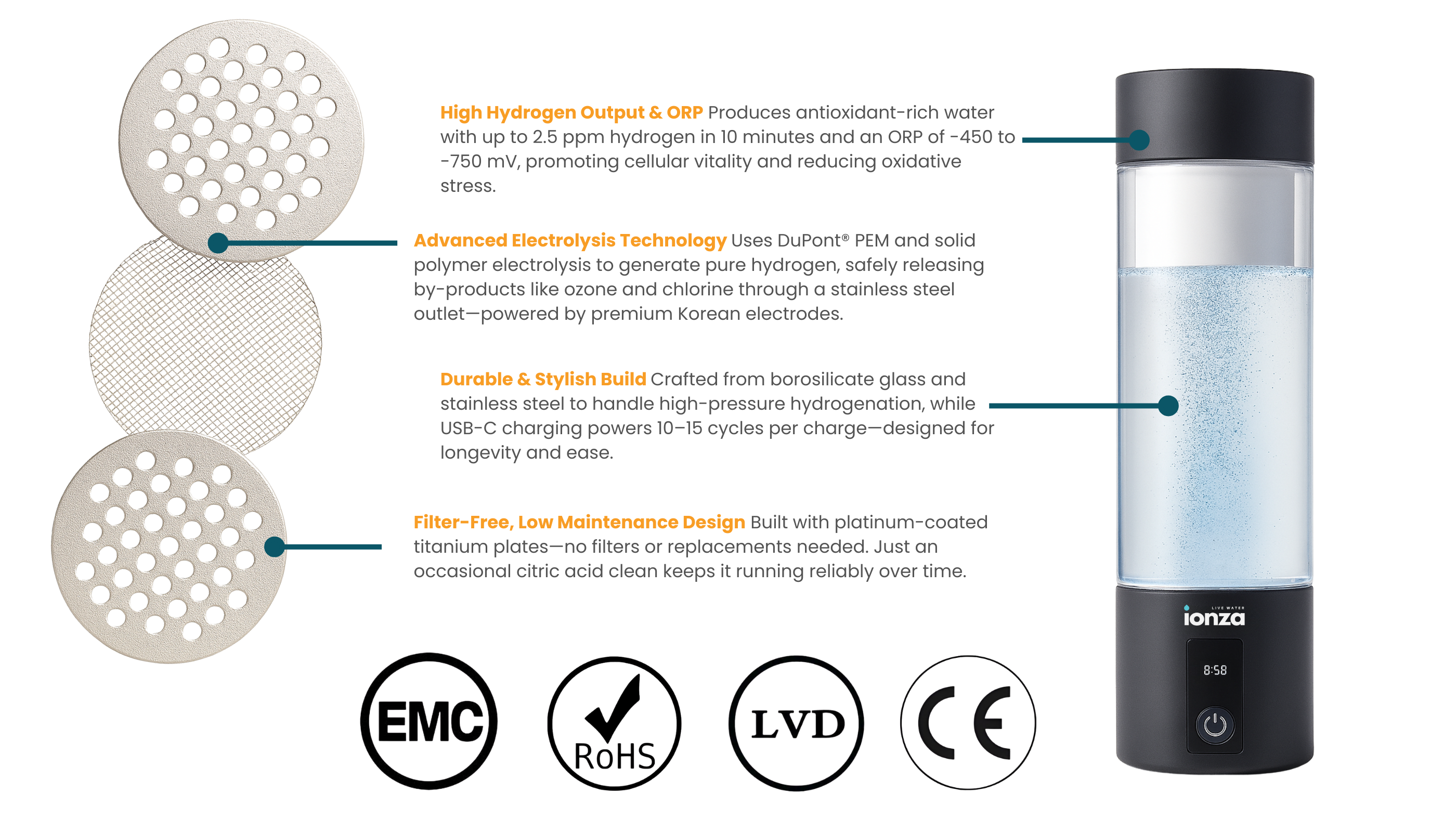The Ionza Hydrogen Water Bottle isn’t just a tool—it’s a health transformation in a bottle. Whether you're chasing better energy, faster recovery, or proactive longevity, the benefits of molecular hydrogen are real, well-documented, and ready for daily use.