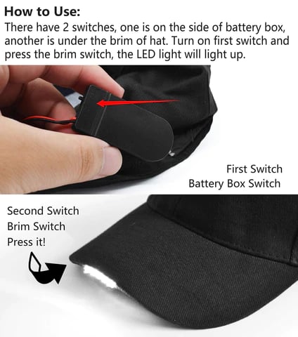How to use: the led baseball cap has 2 switches, one is on the side of the battery box, and the other one is under the brim of a hat; You should turn on the first switch and then press the brim switch, and the LED light will light up, which is easy to turn it on or off