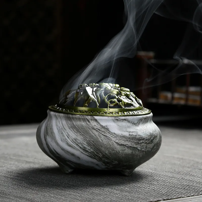 The imitation stone grain design adds a natural aesthetic to your space, making it an eye-catching addition to your home. The earthy tones and elegant alloy cover enhance its appearance, allowing it to fit in seamlessly with any home décor style. Whether placed on a side table, bookshelf, or countertop, this incense burner will serve as both a functional tool and a decorative piece.