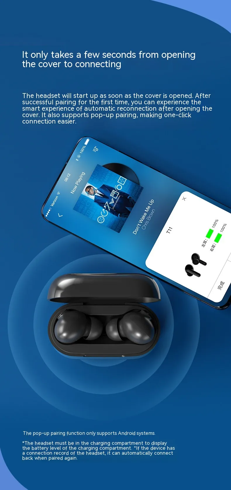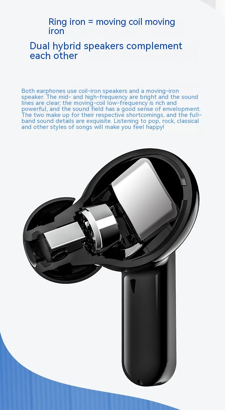 Magnetic suction charging: Both the charging case and earphones are equipped with built-in magnets, which use a magnetic suction charging