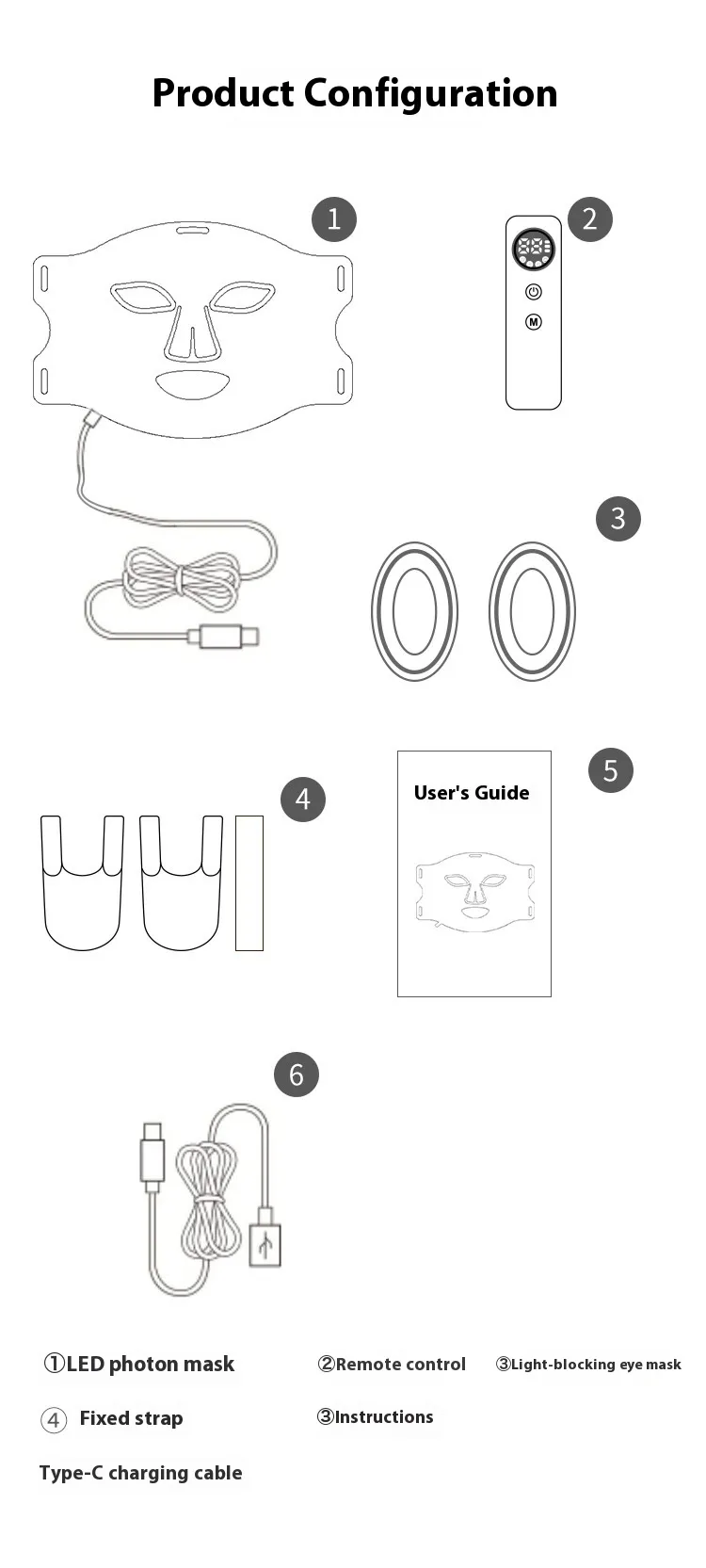 Mask×1pc, remote control×1pc, eye mask×1pc, strap×1pc, charging cable×1pc