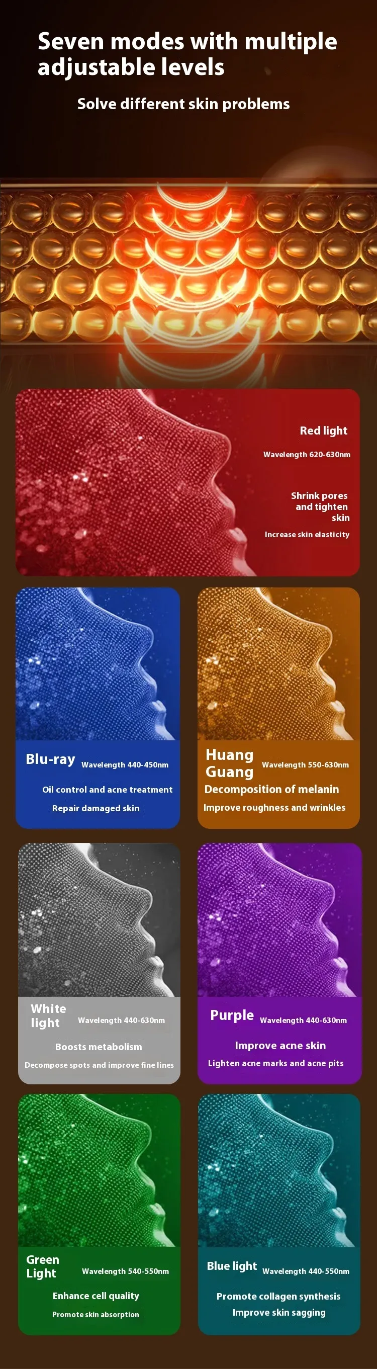 - Red Light: Helps reduce wrinkles, stimulates collagen production, and enhances skin elasticity.