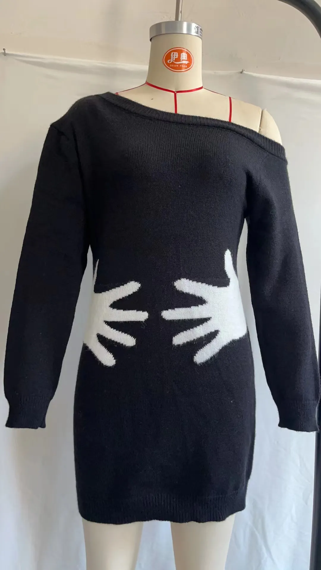 Ins Palm Print Design Knit Dress Fashion Slant Shoulder Long Sleeve Wrap Hip Slim Dress