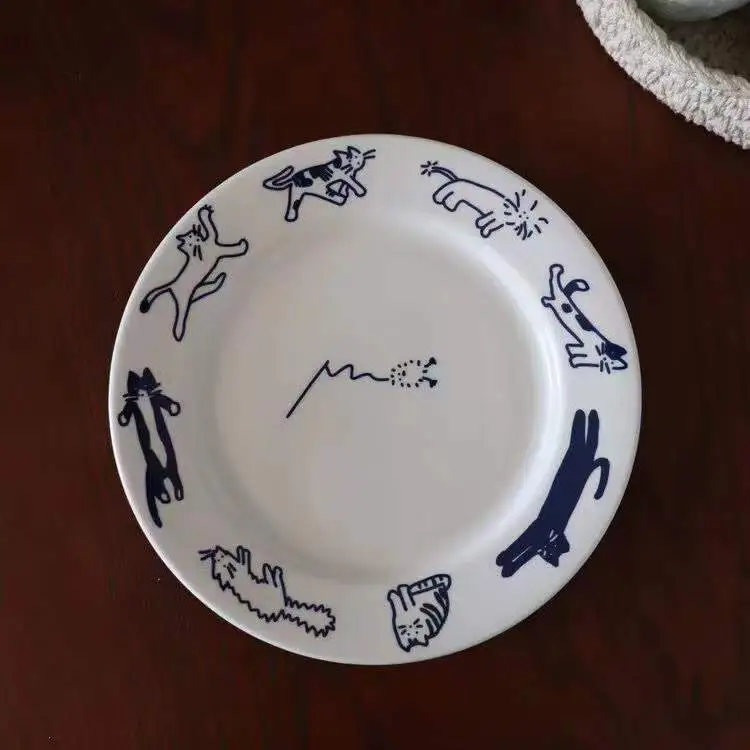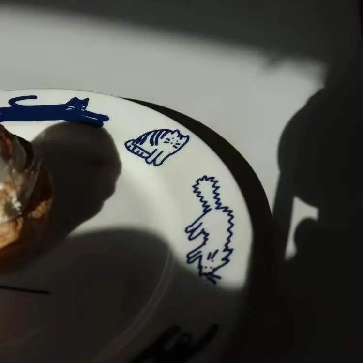 Ins Retro Kitten Blue Breakfast Ceramic Plate Dessert Plate Western Dinner Plate Lovely Girl Heart French