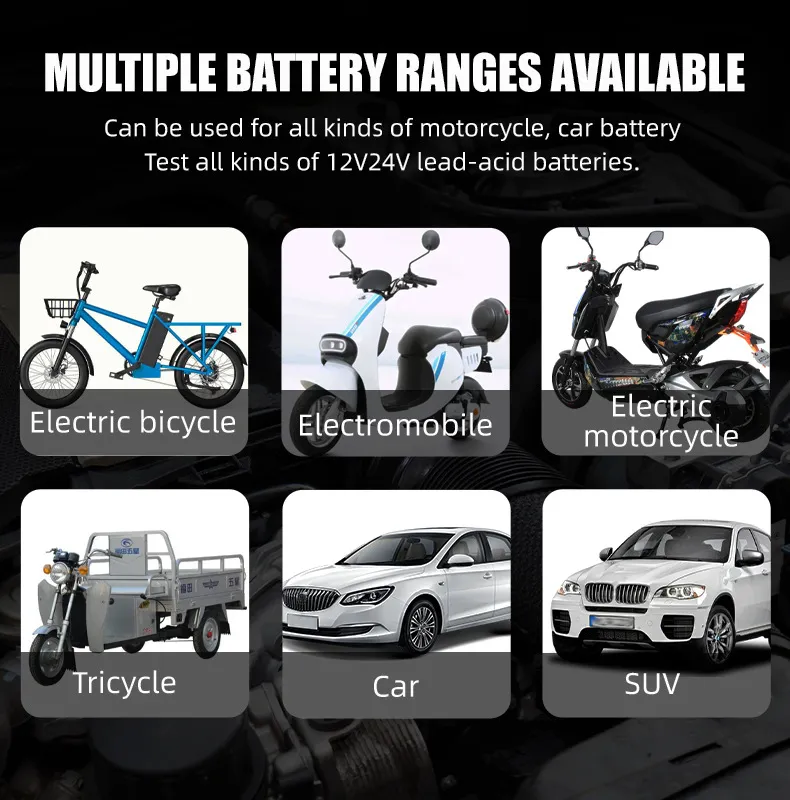 This device is compatible with most 12V and 24V lead-acid batteries, making it ideal for use in a wide range of vehicles, including cars, trucks, motorcycles, and even heavy-duty machinery. Whether you own a personal vehicle or manage a fleet, this test device is a versatile tool for anyone looking to extend their battery's lifespan and ensure reliable performance.