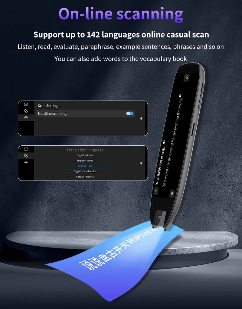 Photo Scanning Technology: The pen can scan and translate text from physical documents, books, menus, or signs, offering