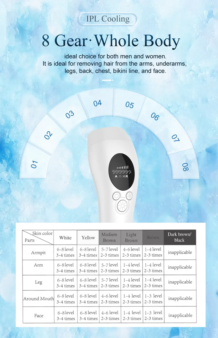 Say goodbye to the pain of traditional hair removal methods. The Freezing Point Technology ensures a cooling effect during each pulse, providing a comfortable and virtually painless experience. This soothing feature reduces discomfort and irritation, allowing you to focus on your grooming routine without any distractions. The combination of IPL and freezing point technology ensures an enjoyable and stress-free hair removal process, even for those with sensitive skin.