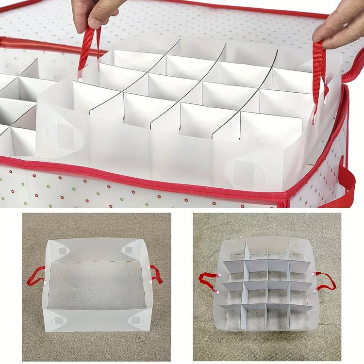 Each ornament has its own individual compartment, so you can store your baubles, tree decorations, and smaller holiday items without worrying about them getting scratched or damaged. The double zipper closure ensures that the box stays securely closed, while the red lid adds a festive touch, making it easy to identify amongst other holiday storage.