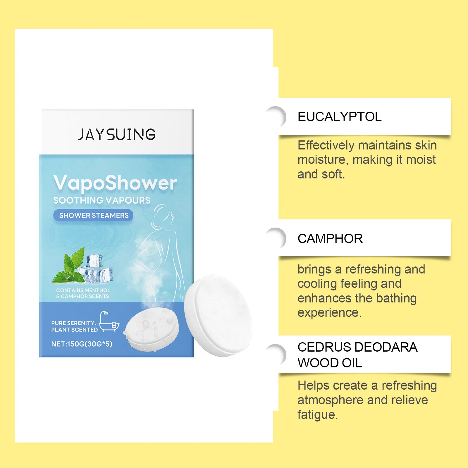 Jaysuing VapoShower Soothing Vapours Shower Steamers are a quick and easy way to add a refreshing, calming experience to your shower. With soothing menthol and camphor vapours, they help to clear your sinuses and relieve stress, turning any shower into a relaxing, spa-like experience. Perfect for daily use, these steamers offer a refreshing retreat that fits into your routine.