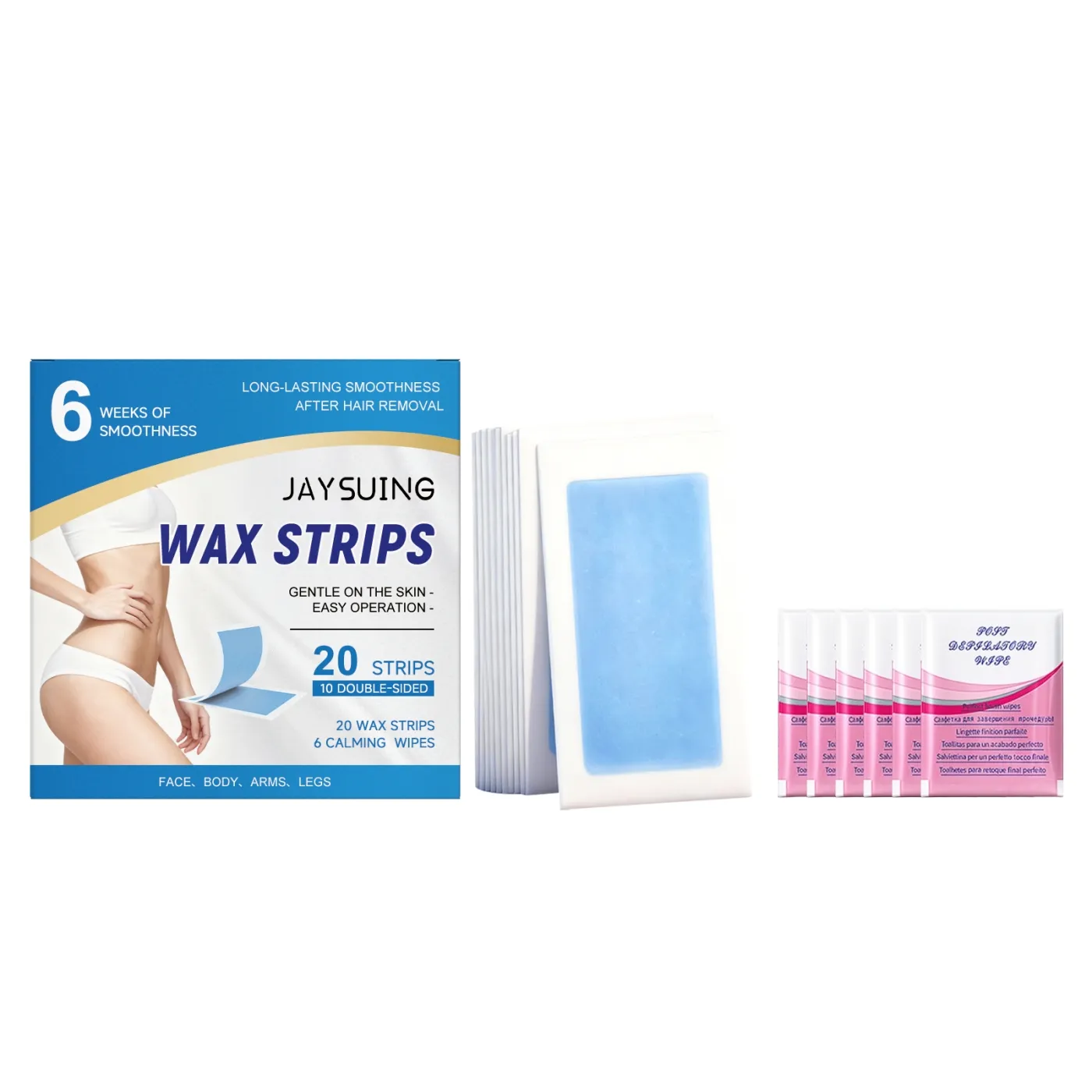 wax strips, hair removal wax strips, Jaysuing wax strips, double-sided wax strips, long-lasting smoothness, body hair removal, easy waxing strips, calming wipes, smooth skin wax strips, face and body wax strips