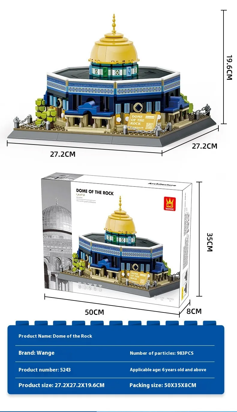 The Jerusalem Rock Dome Mosque Assembled Building Blocks set offers a detailed replica of the Dome of the Rock, showcasing the mosque’s intricate architectural features. From the golden dome to the mosaic tiles and arched doorways, every element of this iconic structure is carefully recreated using high-quality building blocks. The model captures the mosque’s unique blend of Islamic architecture and historical significance, allowing builders to appreciate the cultural and architectural beauty of the site.
