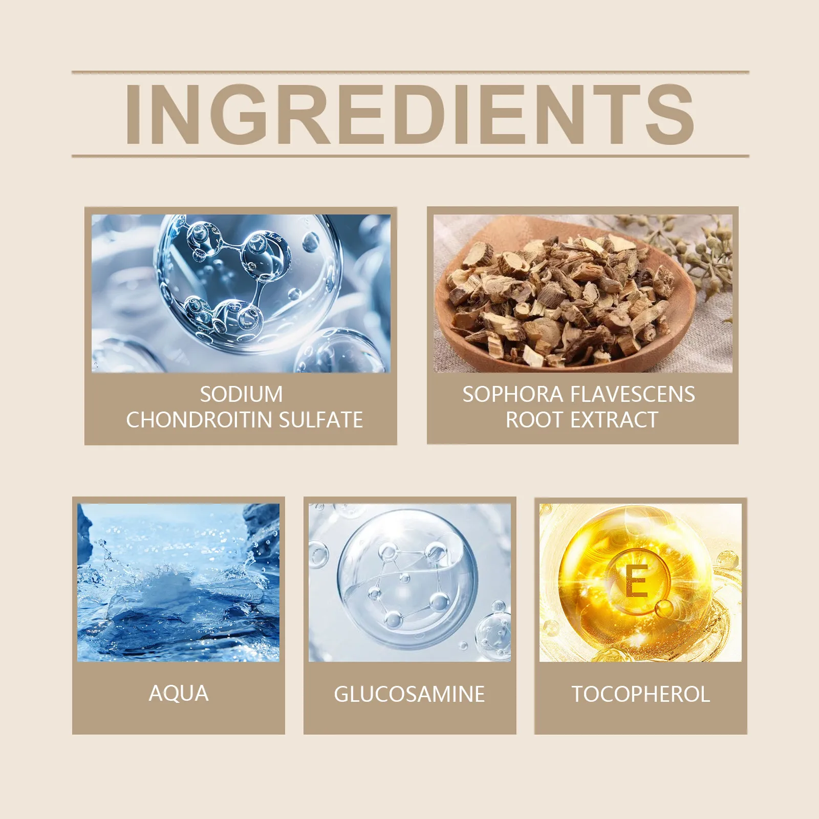 Ingredients: water, sodium chondroitin sulfate, kuh-Seng extraction, glucosamine, tocopherol (vitamin E)