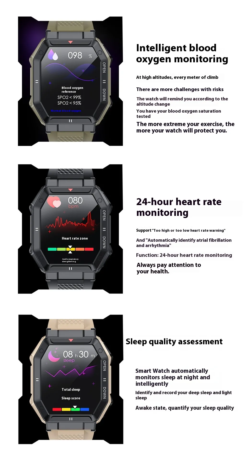 Functions: social entertainment, Bluetooth calling, smart reminder, remote control selfie, sleep monitoring, blood oxygen detection