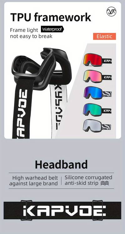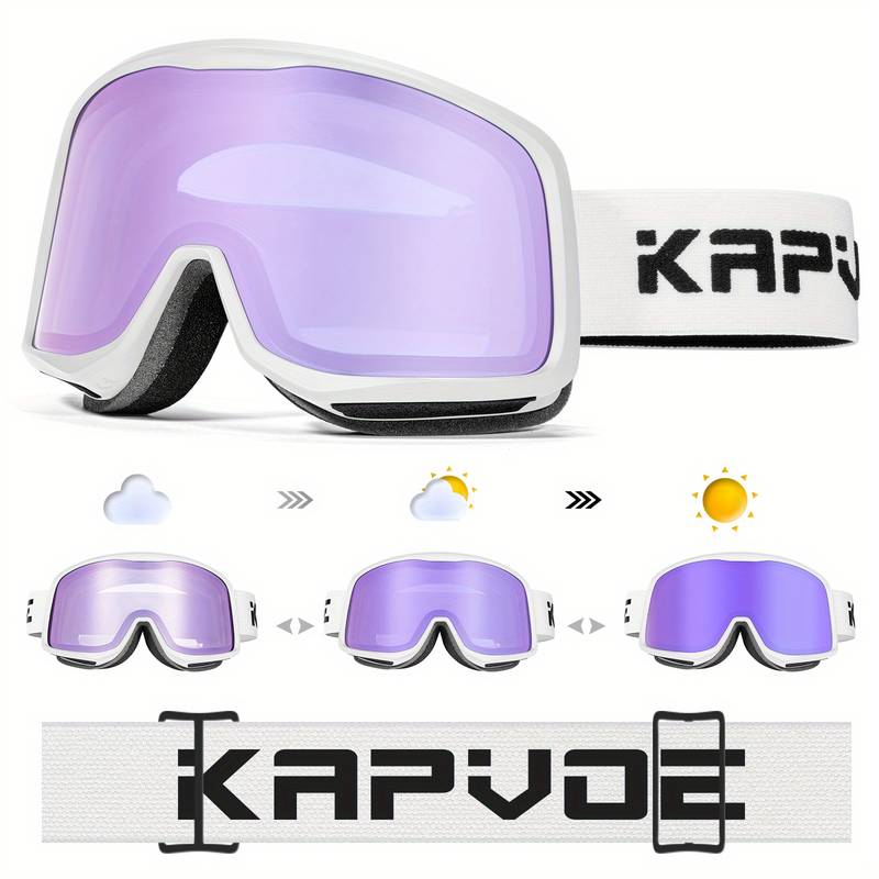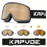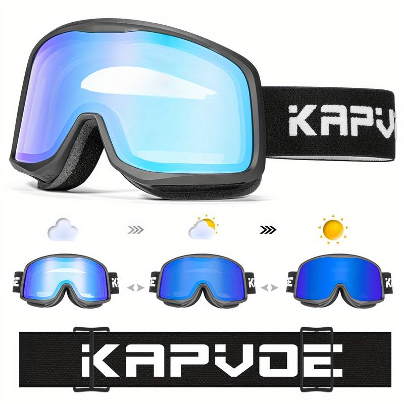 Brand: KAPVOE Included items: Ski goggles, EVA storage case, and a bag for the goggles. Item report: Photochromic feature: The ski goggles adjust their tint based on UV light intensity while maintaining clear visibility. Anti-fog coating: Minimizes fogging during vigorous activities. TPU frame material: Ensures a comfortable and sturdy frame for extended use.The frame is designed with ergonomics in mind, allowing the glasses to rest at an ideal height for any face shape. This thoughtfu