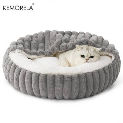 KEMORELA Calming Warm Kitten Bed Round Hooded Plush Cat Cave