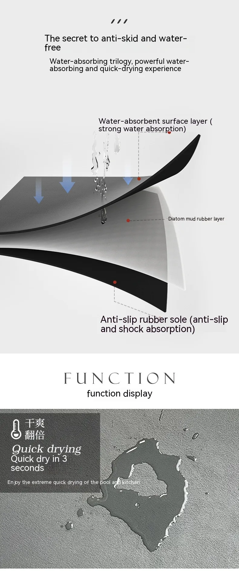 Non-Slip Base: With a non-slip backing, the mat stays securely in place, preventing it from shifting while you dry your