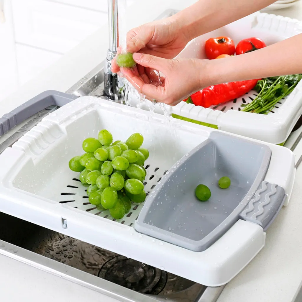 New upgrade multi-function cutting board, sink basket.Bottom hollow design, easy to drain.Storage trough design, Easy to take.