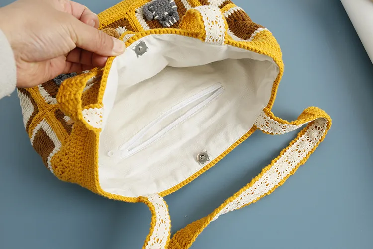 Despite its compact square shape, the Kitten Handmade Wool Crocheted Bag offers ample space for your essentials. Its interior is thoughtfully designed to keep your belongings neat and accessible.