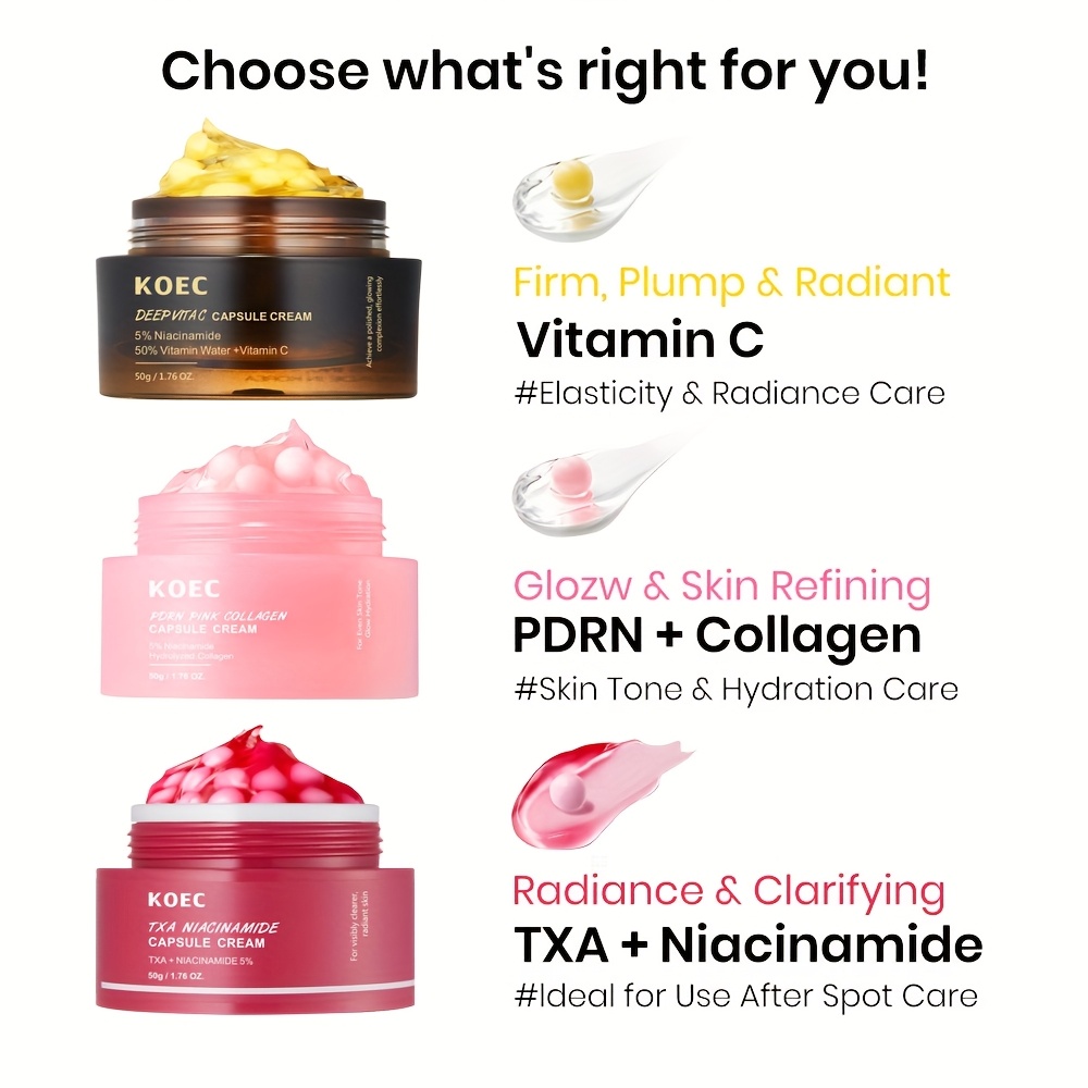 The KOEC Capsule Cream Trio is a multi-solution skincare collection developed to address key skin concerns using encapsulated active ingredients. Each cream features a capsule-based texture that releases beneficial ingredients upon application, allowing for fresh, even distribution across the skin.