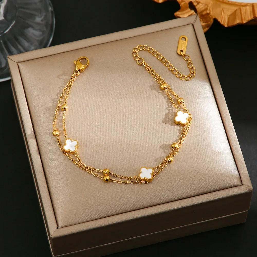 Bring luck, elegance, and modern design to your wrist with the Korean Minimalist Mini Double-Sided Four-Leaf Titanium Steel Bracelet.