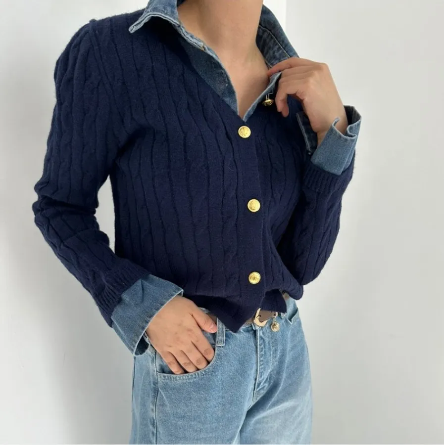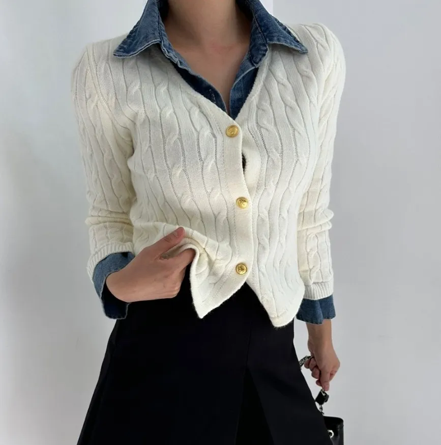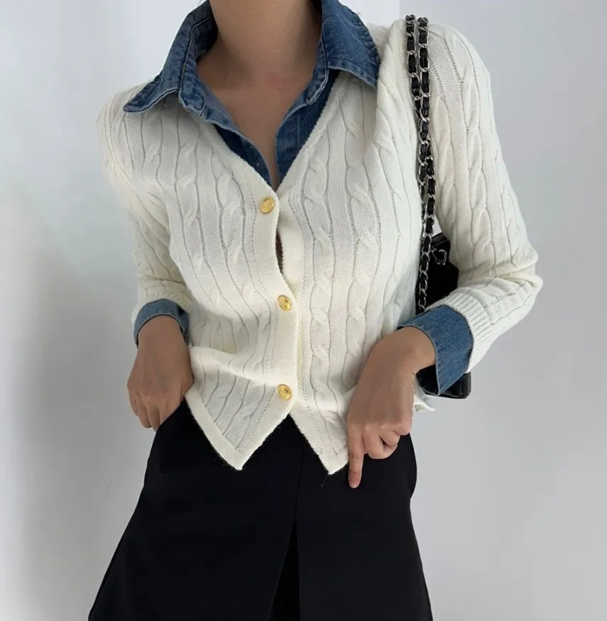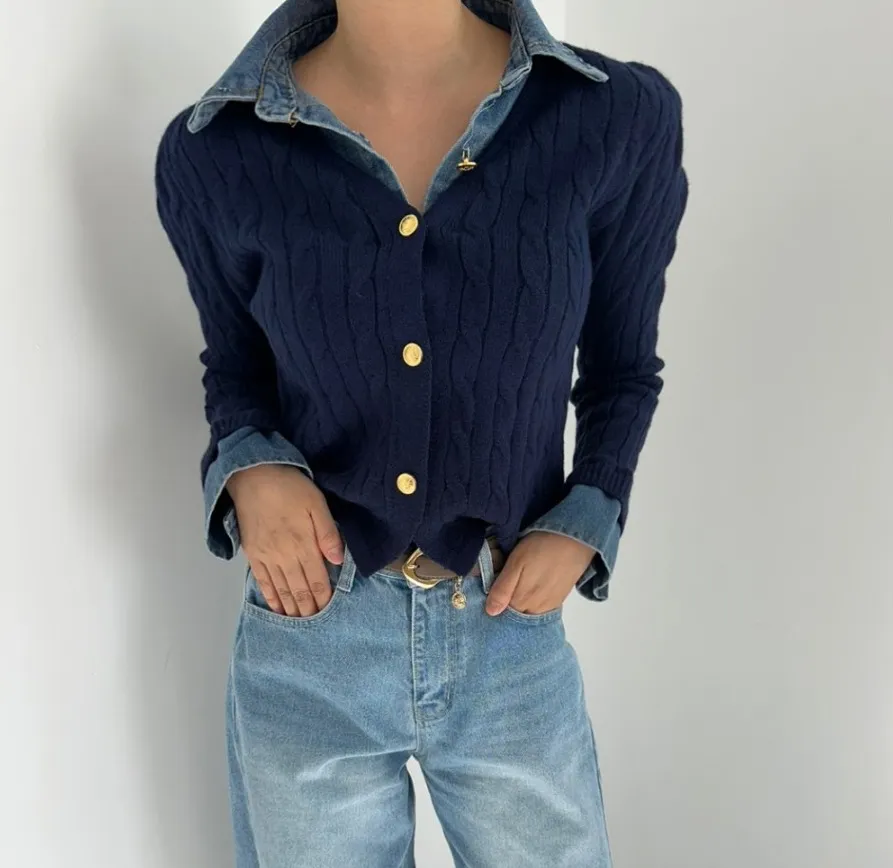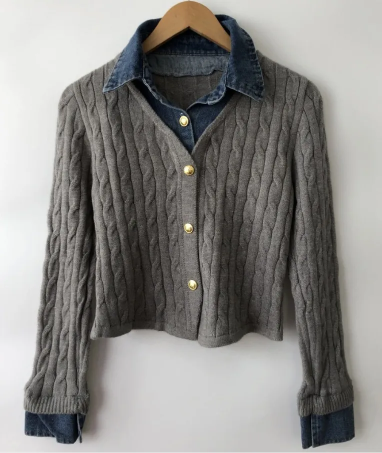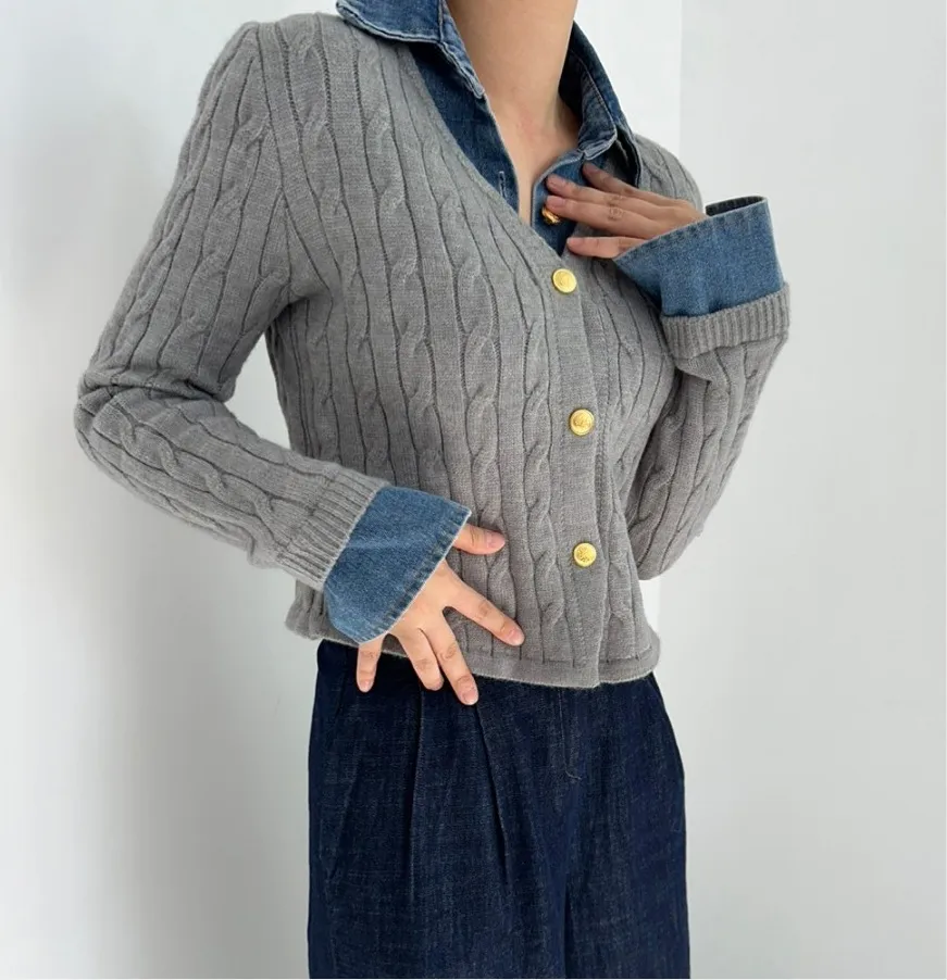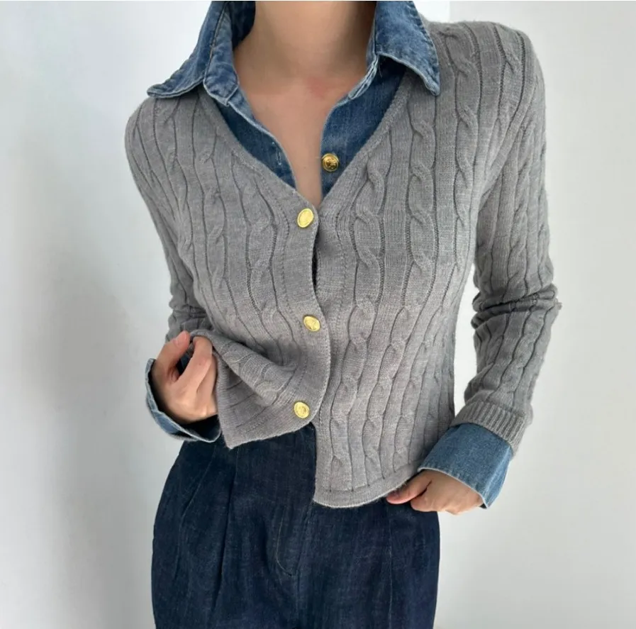 Korean Style Contrast Color Knitwear Denim Stitching Long Sleeve Sweater