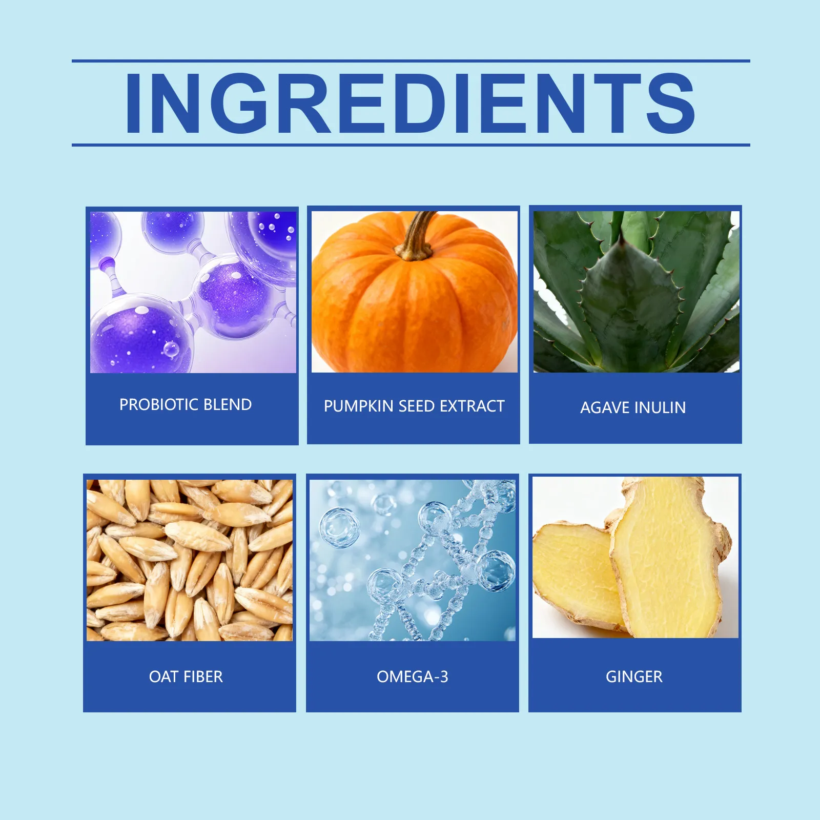 seed extract (pumpkin seed), agave inulin (agave root), oat fiber (oat), omega-3 (from Alaska wild cod oil) and ginger (ginger root).