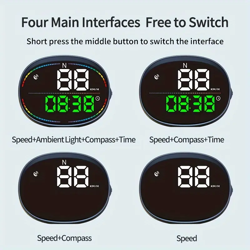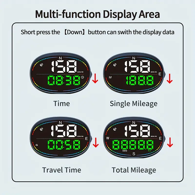 -Compatible With: Suitable for all cars-Display Data: Speed (KM/H, MPH, Free to For Switch), Time, Total Mileage, Single Mileage, Driving Time, Current Direction (E/S/W/N)-Feature: 1. Speed Unit: KM/H, MPH(Free to For Switch) 2. Automatic and Adjustable Brightness; 3. Over-speed reminder: The light will flash to Conflictn you, if the speed is over your preset speed limit. 4. Material: ABS+PC 5.Size: 80*54*31 mm/3.15*2.12*1.22 inch 6.Power Supply: Car USB Port(Input Voltage: DC 5V). 7. LED Screen, Large Font; 8. With Atmosphere Light; 9. Four Main Interface; 10. With compass function, can show current direction(E, S, W, N)