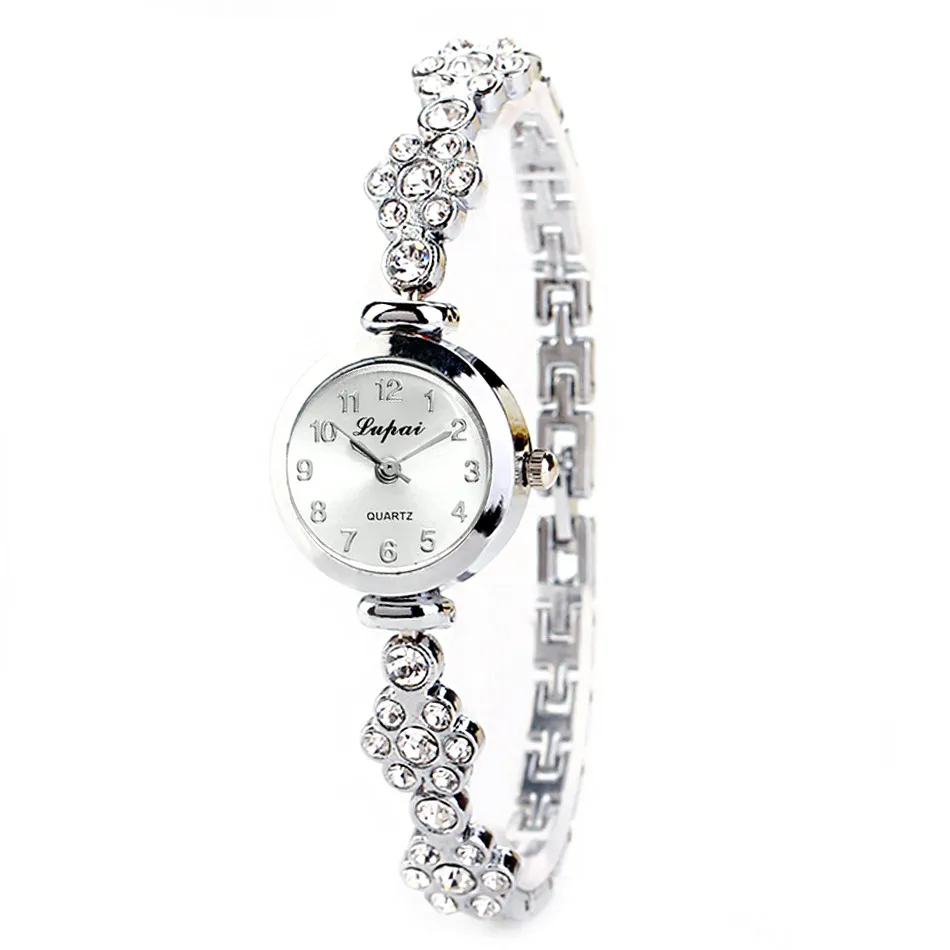 A bracelet watch for ladies typically features a band that resembles a bracelet rather than the traditional leather or metal strap. These bands are often designed with links that can be adjustable to fit comfortably on the wrist. The materials used for the bracelet can range from stainless steel, gold, or silver to alloy or leather. Some bracelets may have intricate designs with alternating links that feature flower motifs, giving the watch an overall cohesive and elegant look.