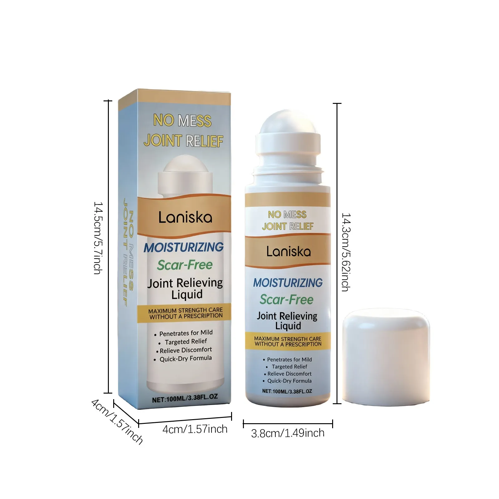 The Laniska Moisturizing Scar-Free Joint Relieving Liquid provides maximum strength joint care without the need for a prescription. This liquid formula is specially designed to target joint discomfort caused by inflammation or strain, providing effective relief for knees, elbows, wrists, and other joints. With its unique roll-on applicator, this liquid offers mess-free application, ensuring precise and clean treatment every time. The quick-dry formula absorbs into the skin rapidly, providing soothing relief without any sticky residue, leaving your skin feeling moisturized and refreshed.