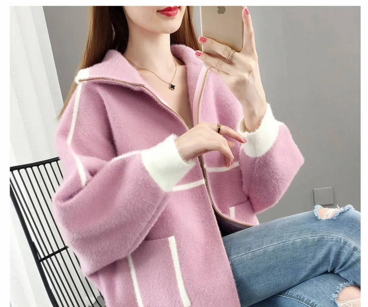 Lapel Zipper Wool Cardigan Coat For Women