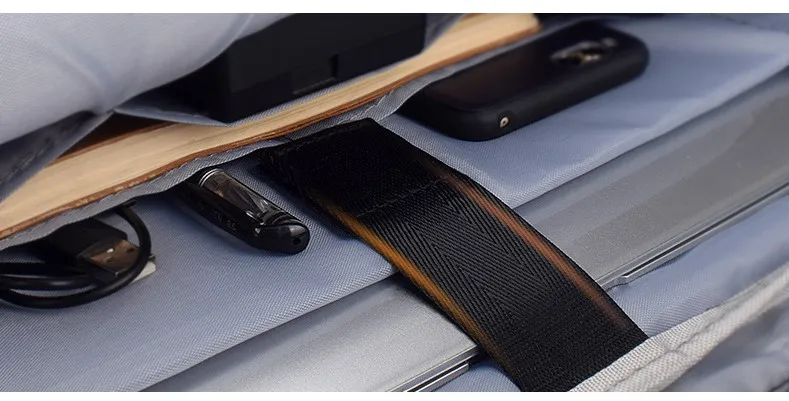 tablet, charger, and other essential accessories. It includes additional compartments for pens, business cards, notebooks, and small