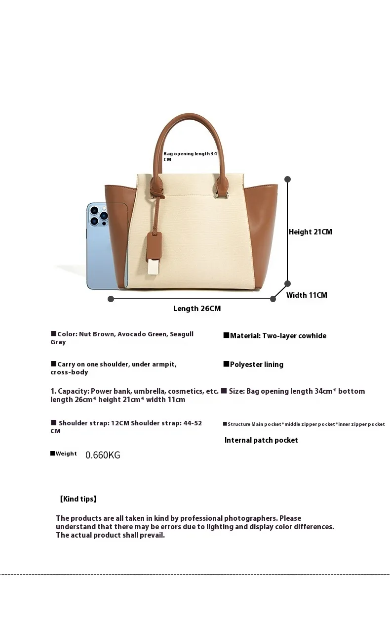 The design of this cowhide tote is simple yet chic, making it easy to match with a variety of outfits. The minimalist aesthetic ensures the bag complements both casual and business looks, while the clean lines and sleek silhouette make it a versatile accessory for any occasion. Whether you're dressing up for a meeting or keeping it casual for a weekend brunch, this tote fits seamlessly into any wardrobe.