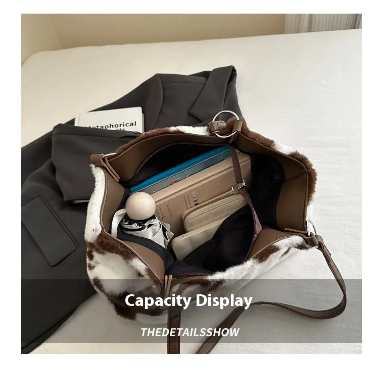Despite its stylish appearance, the Large Capacity Fur Shoulder Tote Bag offers ample space to carry all your daily essentials. The spacious interior can accommodate items such as a laptop, books, wallet, makeup, and more. Whether you’re heading to work, school, or a weekend getaway, this tote ensures you have everything you need in one place.