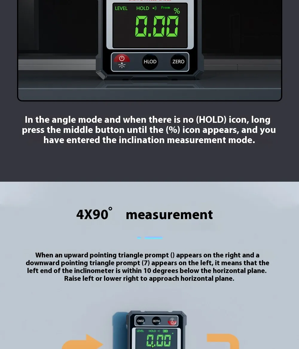 Digital Display: A clear digital screen for easy-to-read measurements in various units such as degrees, meters, or feet.