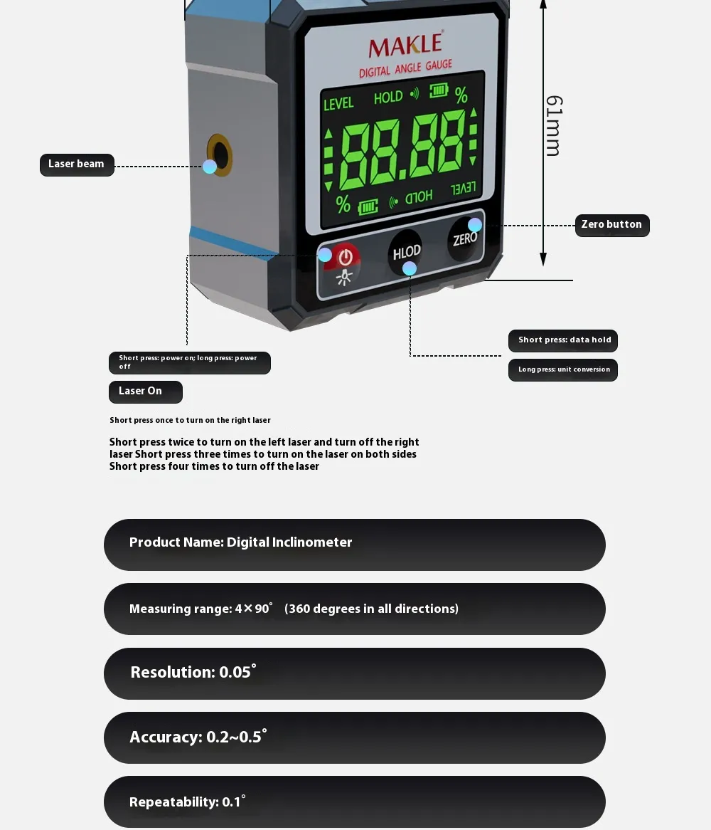 Specification: makle bidirectional laser digital bevel box
