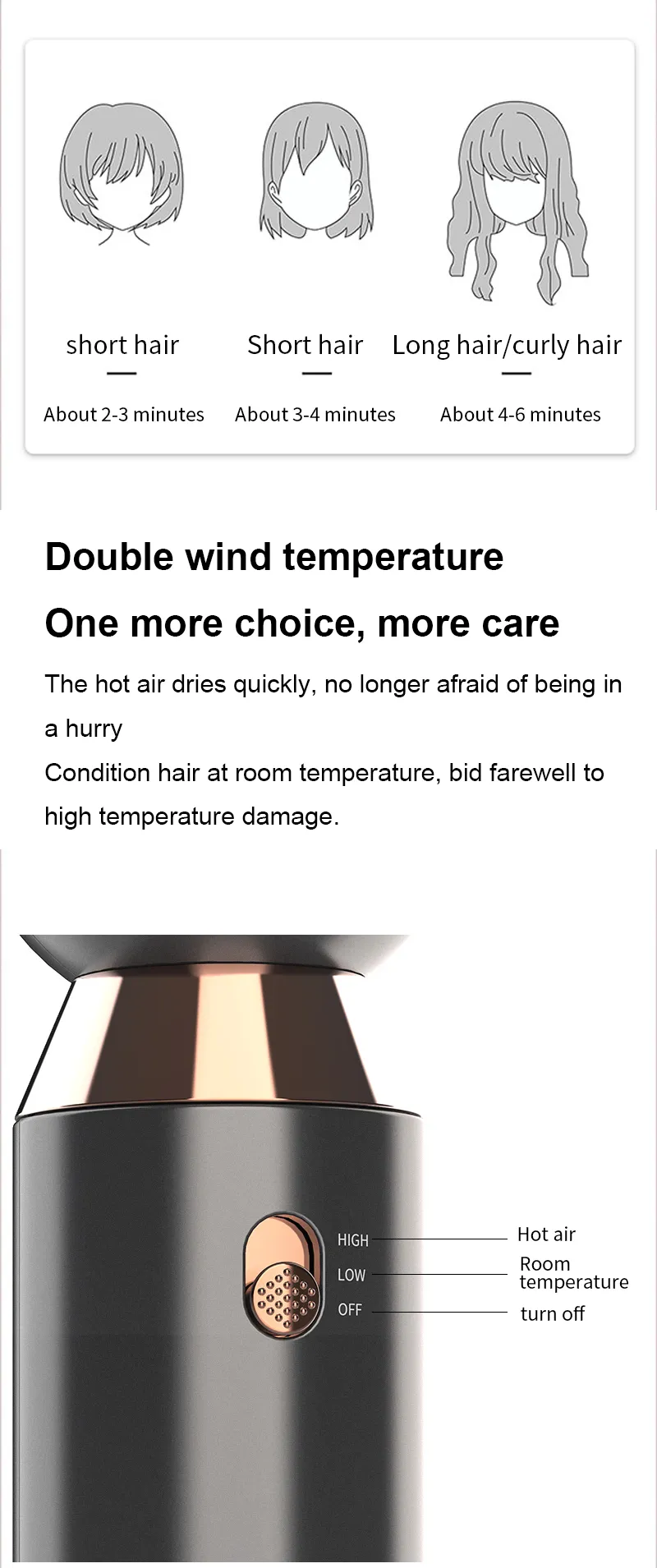 Quick Drying Time: The 800W motor combined with two-speed settings means that your hair dries faster,