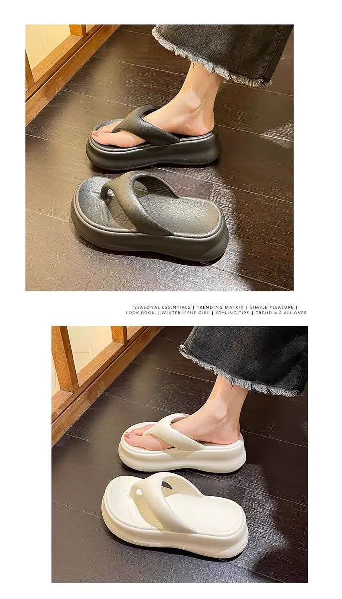 The Leather Chunky Platform Flip Flops are a modern interpretation of the classic flip flop, redesigned to provide enhanced support, durability, and visual impact. Traditional flat flip flops often lack cushioning and structure, which can lead to discomfort during extended wear. This design addresses those limitations by incorporating a thick platform sole and a quality leather upper, delivering both comfort and elevated style.