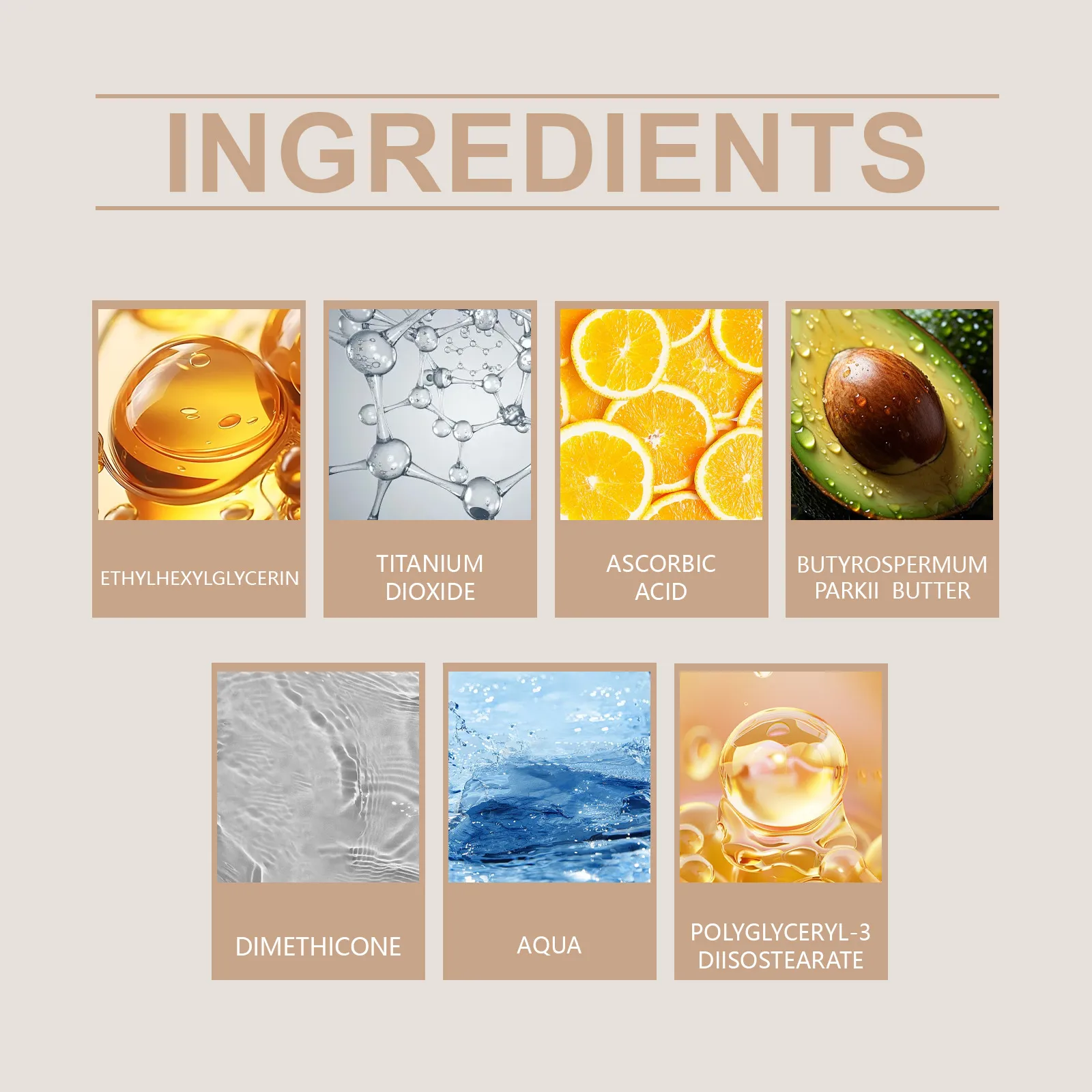 Ingredients: Water, polydimethylsiloxane, polyglycerol-3 diisostearate, titanium dioxide, ethylhexyl glycerol, vitamin C ascorbic acid),