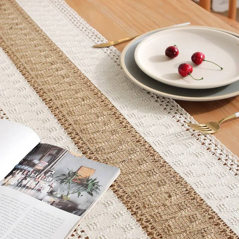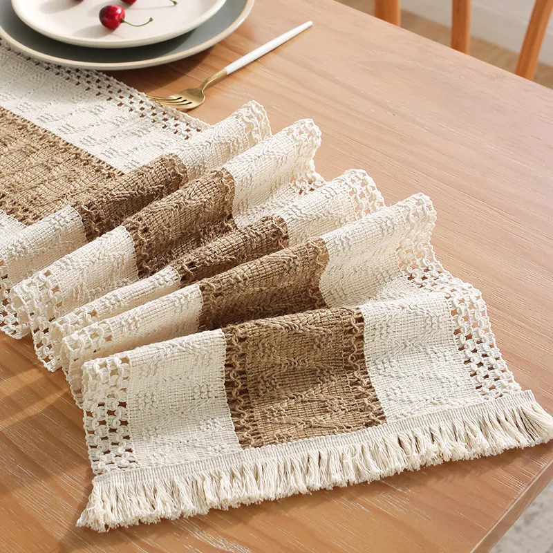 Rustic table runner with handmade tassel home decorations.