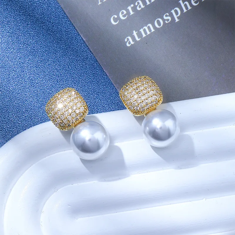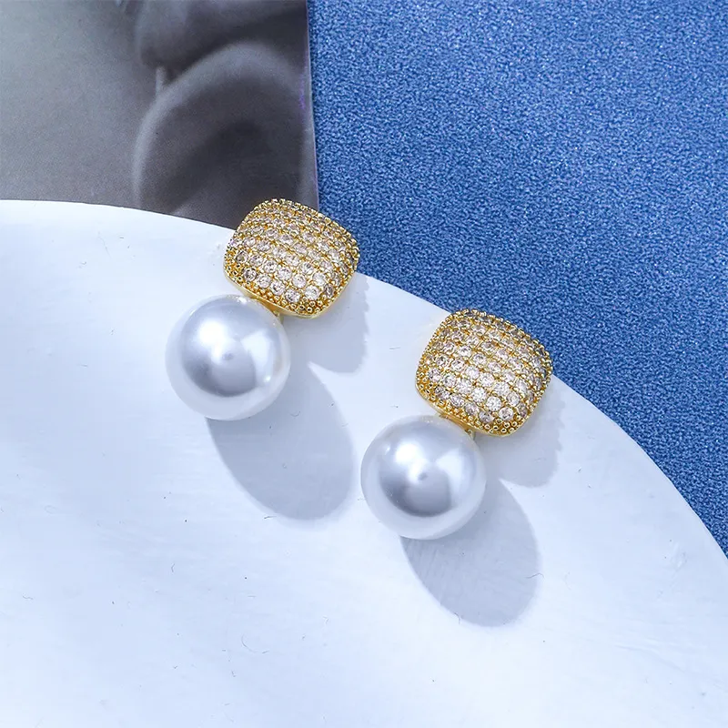 Light Luxury Square Full Diamond Pearl Ear Studs Make Your Face Look Smaller