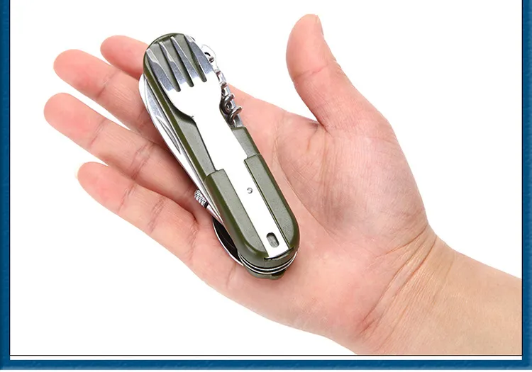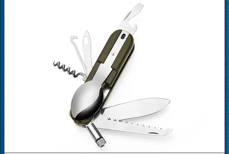 Function: forks, spoons, knives, bottle opener, saws and other functions, LED lights: Open: clockwise rotation. Closed: Shun clockwise