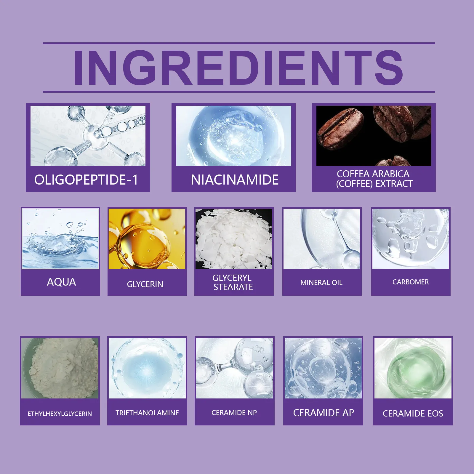 AP, ceramide EOS, nicotinamide, coffee extract, Oligopeptide-1