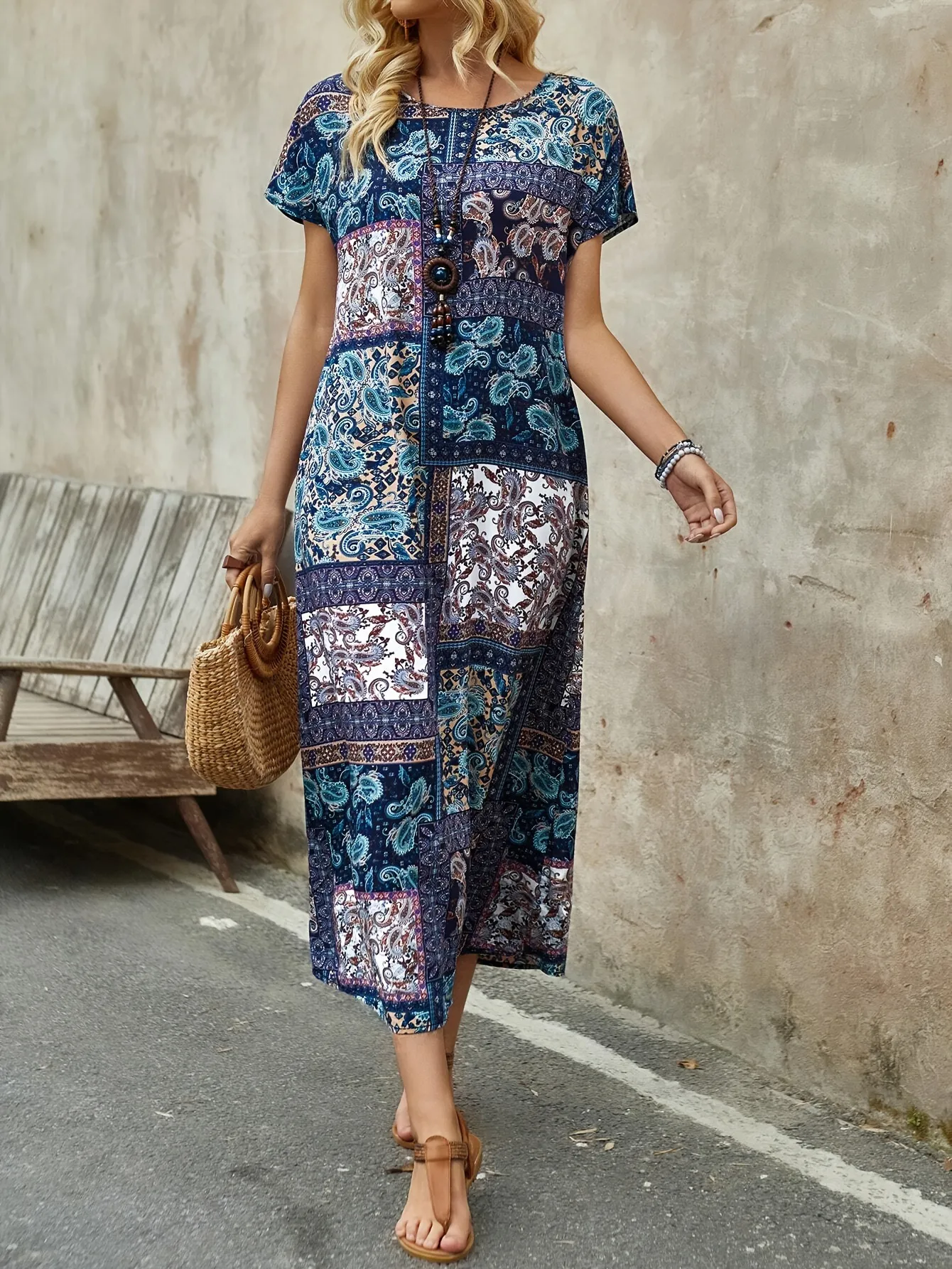 Long Printed Short Sleeve Round Neck Dress – Comfortable, Stylish, and Versatile