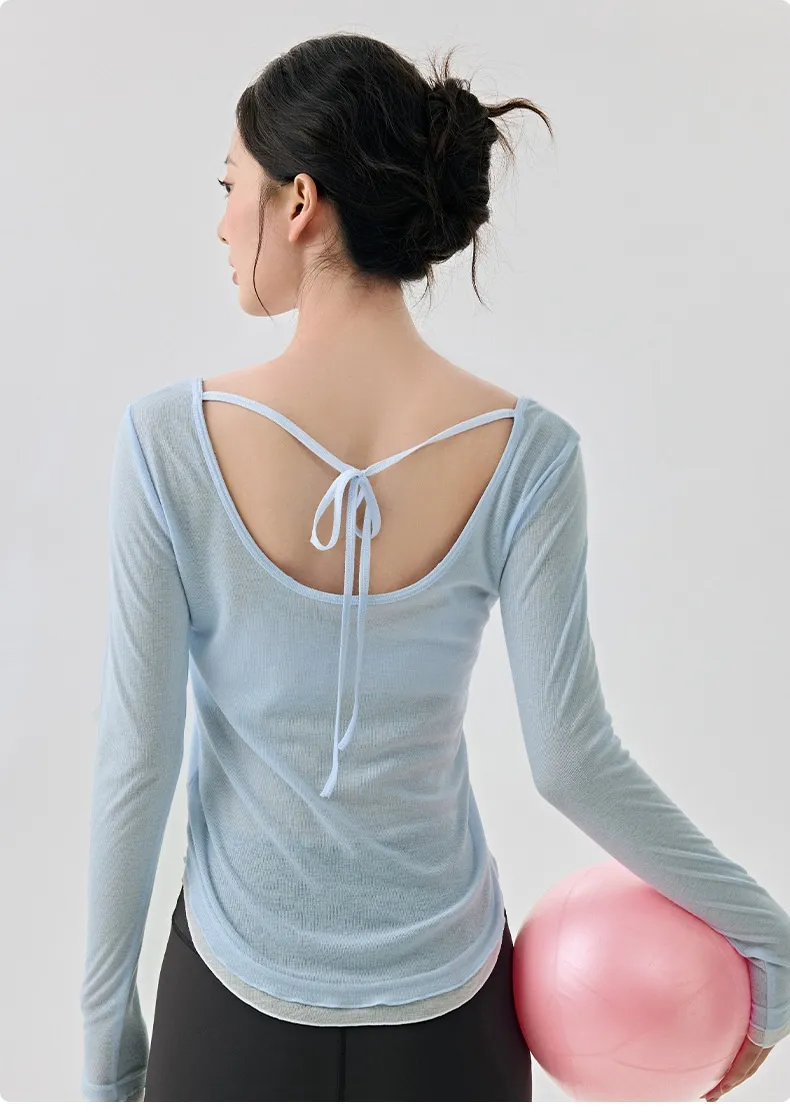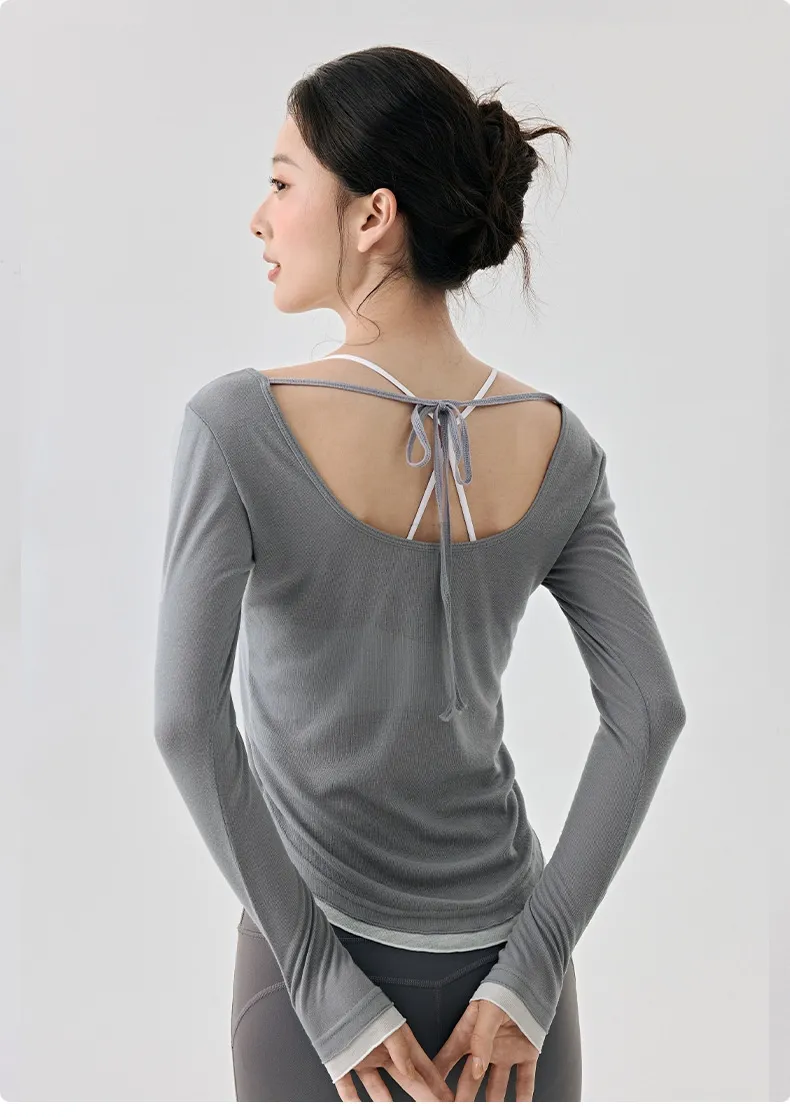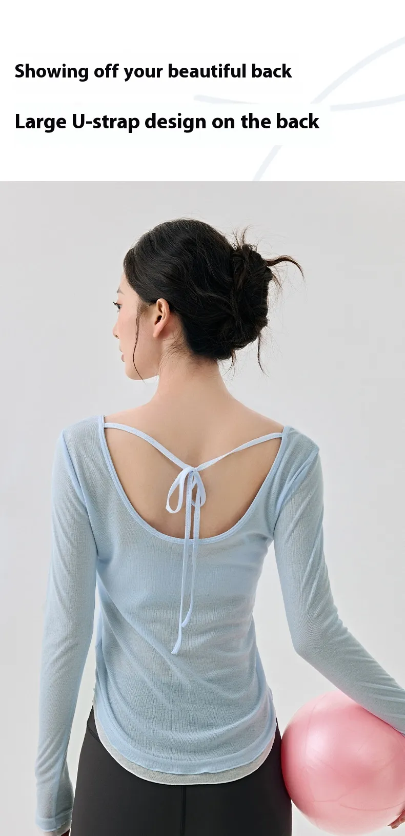 Stylish and Sexy: The backless design and contrast color hem give this yoga blouse a modern, fashionable look that’s