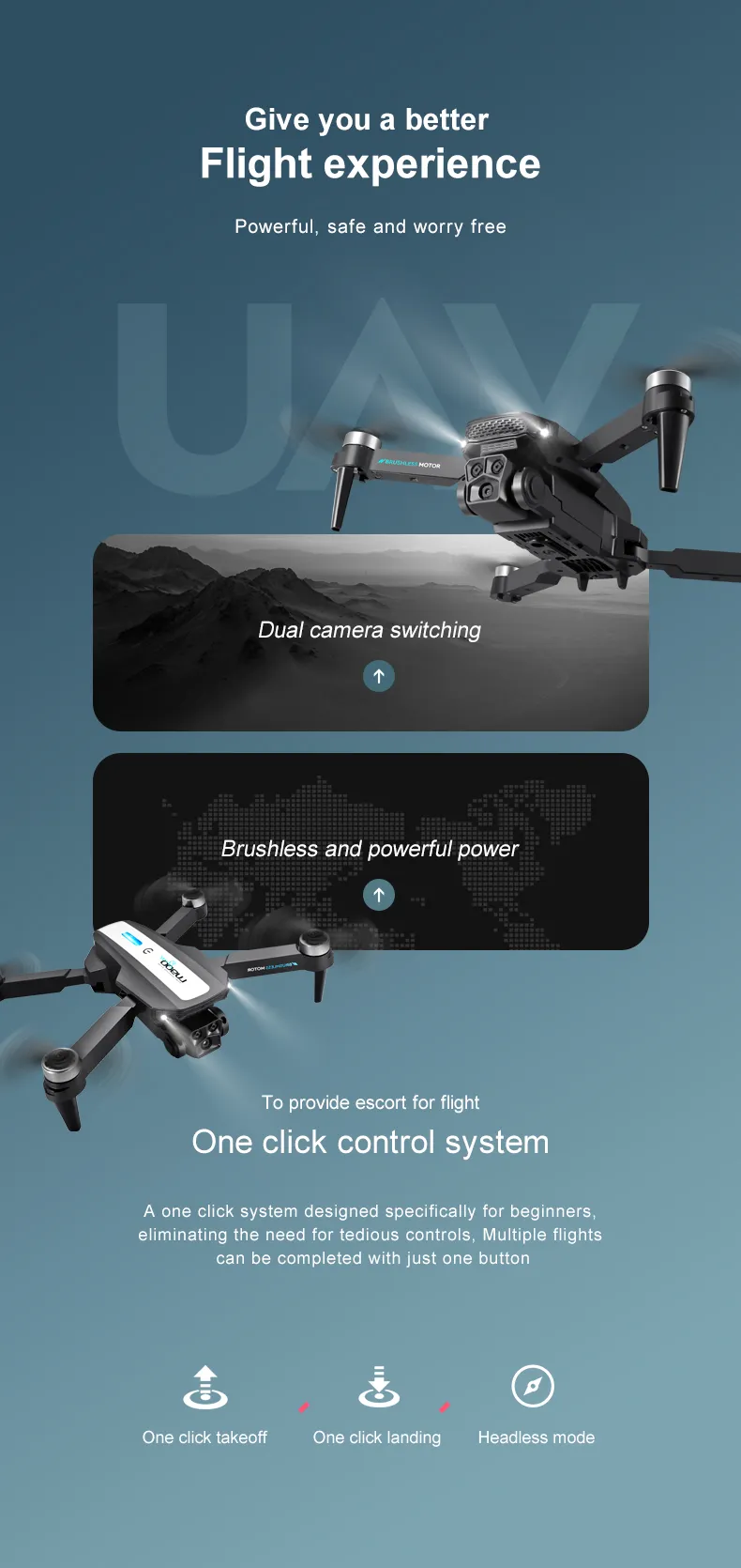 -Headless mode, no need to adjust aircraft position before flight.
