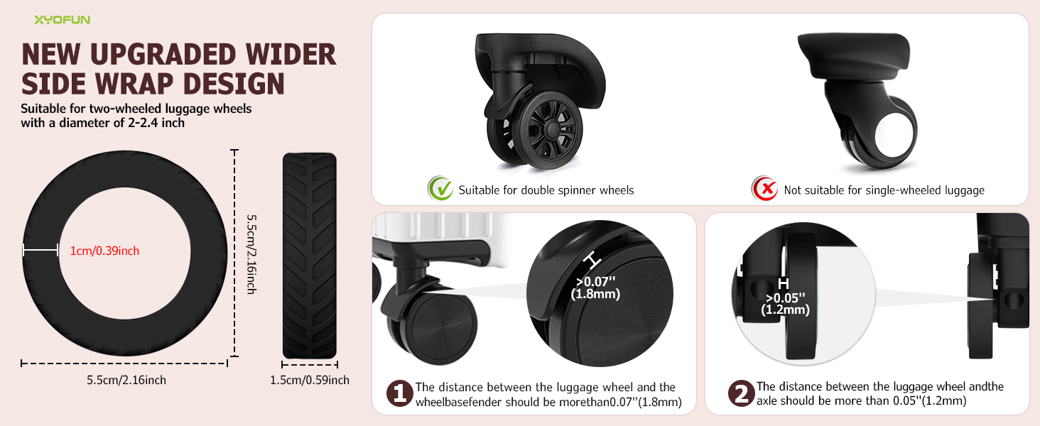 - 【You Should Know】Luggage wheels cover are designed specifically for 8-spinner wheels carry on suitcase.Before purchasing, please confirm that your suitcase is double-wheeled, and the size of the wheels and the distance between the wheels and the axles and fenders meet the size requirements described above in our main picture.