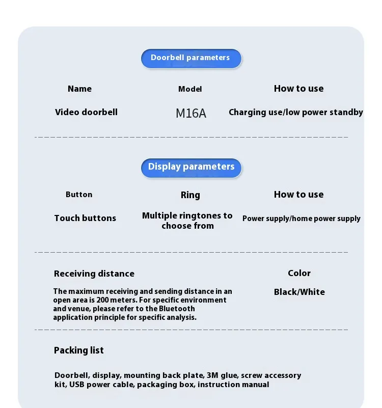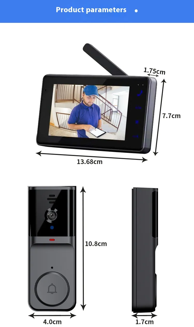 Specifications: M16A/4.3 inch/duplex two-way intercom/wireless video doorbell, M17A/4.3 inch/duplex two-way intercom/wireless video doorbell