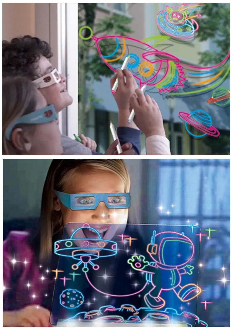 base, and put on the glasses to start drawing, this 3D fluorescent drawing board is small in size, light in weight, and easy to carry.