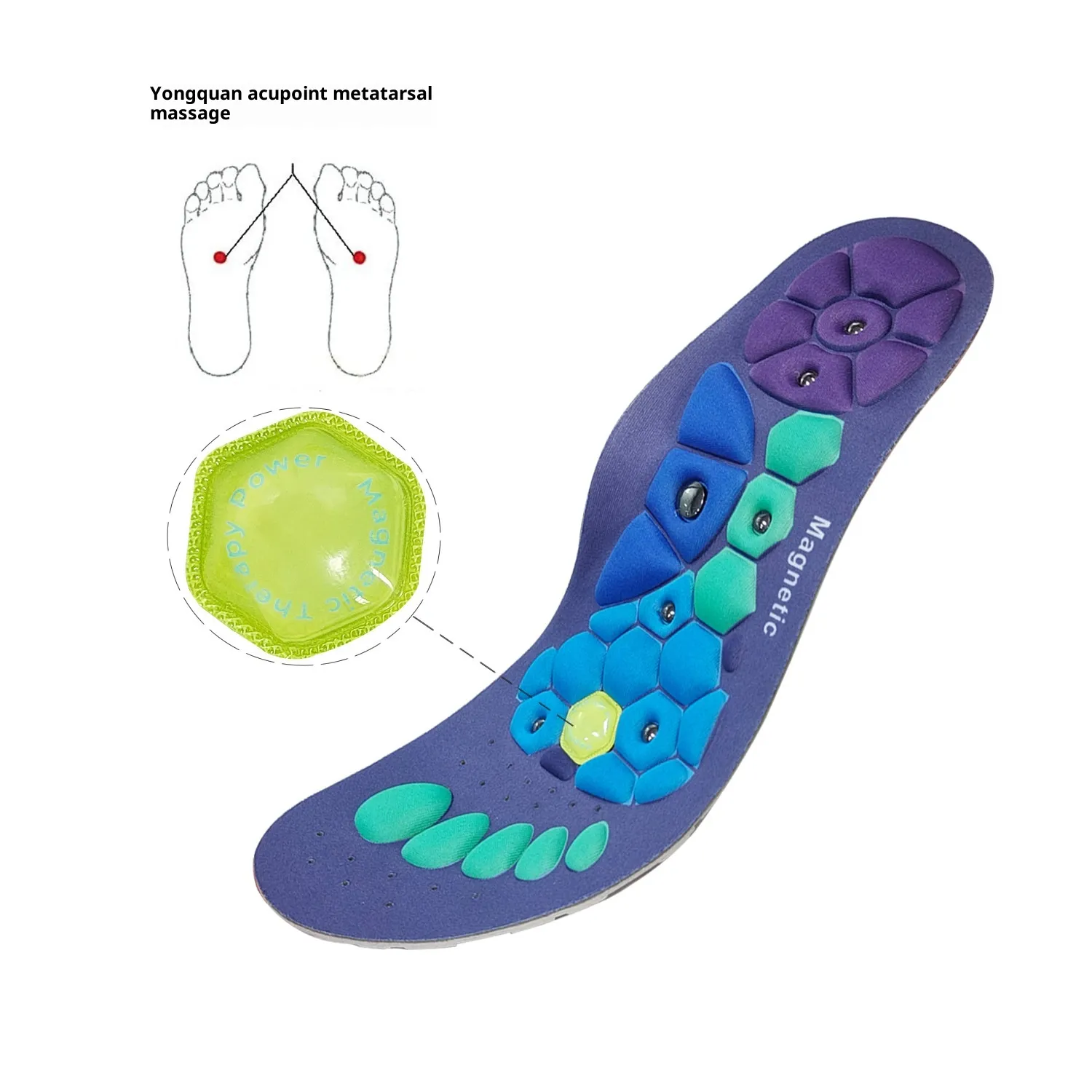 Magnetic inserts are strategically placed within the insole to support circulation and provide subtle magnetic stimulation at pressure points. The design balances effective foot support with gentle acupressure contact to help reduce tension and improve overall comfort during prolonged standing or walking.