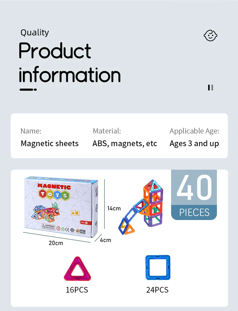 Magnetic Building Blocks Classic Toys offer an exciting, engaging, and educational experience that sparks creativity and fosters learning. Designed for children of all ages, these magnetic blocks make building fun, safe, and easy. With their powerful magnets and a variety of shapes, sizes, and colors, these blocks are the perfect tool to unlock your child's imagination while teaching them valuable skills in STEM (Science, Technology, Engineering, and Mathematics). Whether your child is creating geometric shapes, complex structures, or abstract designs, these toys provide endless possibilities for play, learning, and growth.